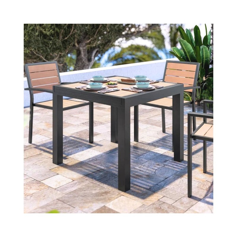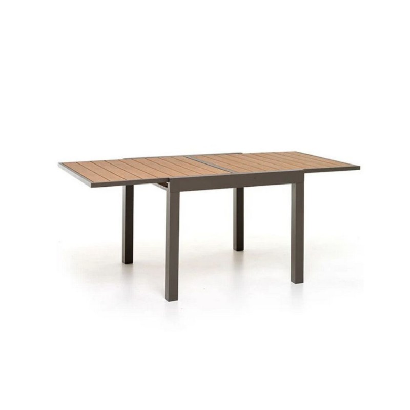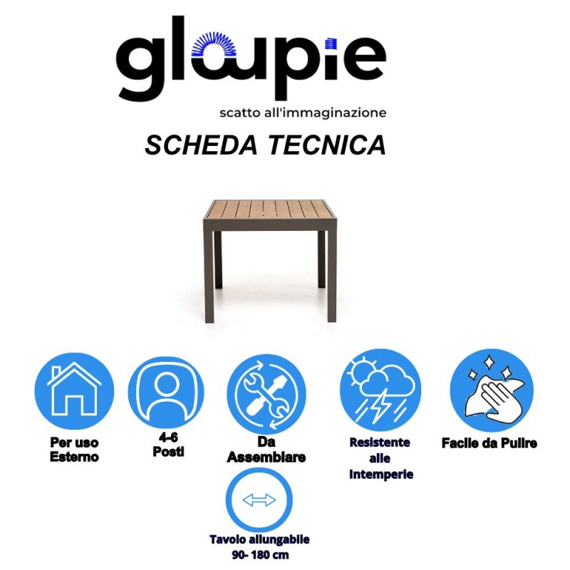Gloupie Tavolo Allungabile Da Giardino Per 6 Persone Santa Fe Con Struttura In Alluminio Verniciato A Polvere Epossidica Di Colore Marrone Resistente Ai Raggi UV E Alle Intemperie, Lunghezza Variabile Da 90 A 180 Cm X Profondità 90 Cm X Altezza 75 Cm, Dotato Di Prolunga Estraibile Con Sistema A Scorrimento E Piano A Doghe In Polywood Dalla Colorazione Teak