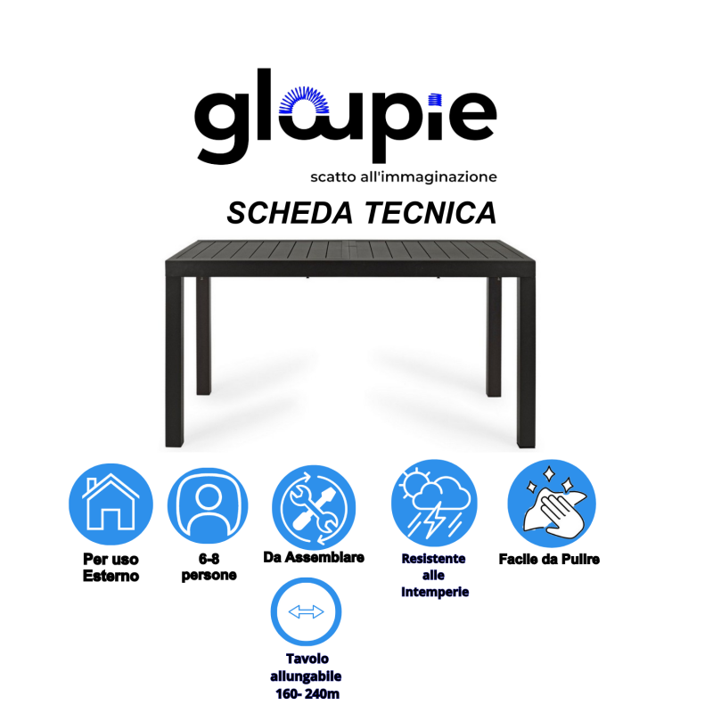 Il tavolo non solo è pratico e funzionale, ma è anche un complemento d'arredo dal design moderno ed elegante che impreziosisce qualsiasi spazio esterno.