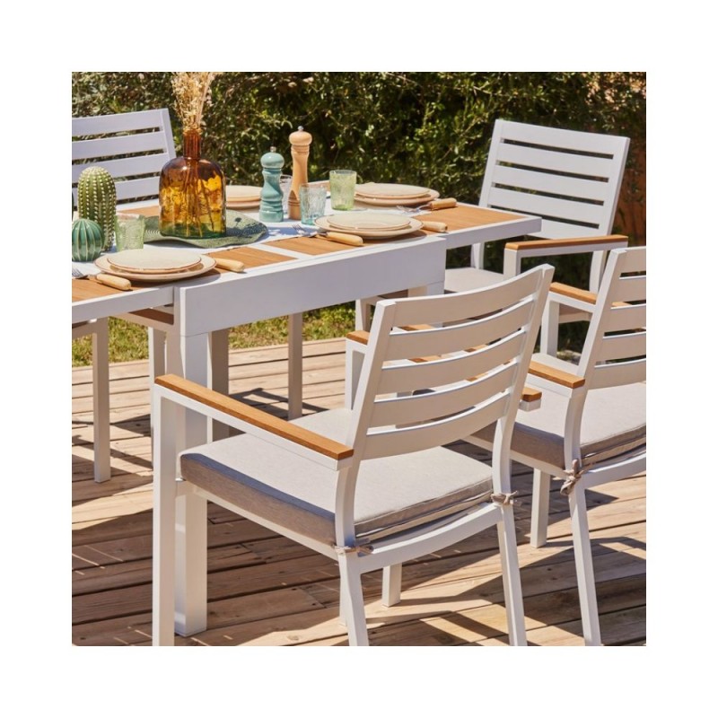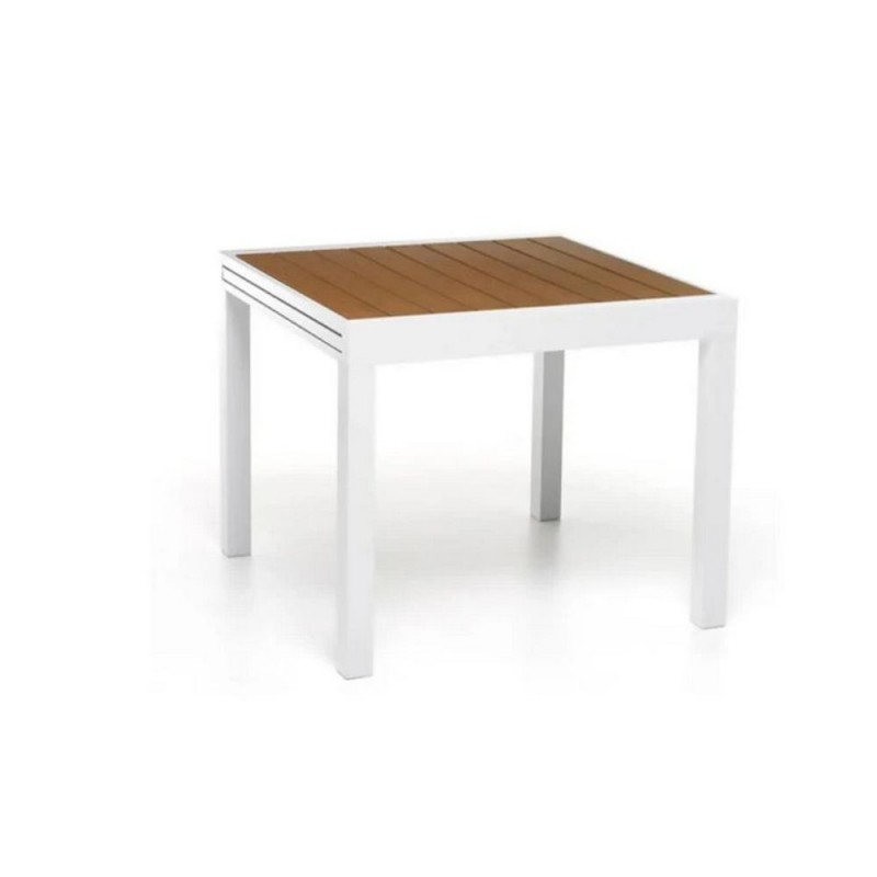 Gloupie Tavolo Allungabile Da Giardino Per 6 Persone Santa Fe Con Struttura In Alluminio Verniciato A Polvere Epossidica Di Colore Bianco Resistente Ai Raggi UV E Alle Intemperie, Lunghezza Variabile Da 90 A 180 Cm X Profondità 90 Cm X Altezza 75 Cm, Dotato Di Prolunga Estraibile Con Sistema A Scorrimento E Piano A Doghe In Polywood Dalla Colorazione Teak