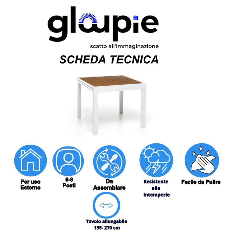 Grazie Alla Sua Lunghezza Regolabile, Il Tavolo Gloupie Si Adatta Perfettamente A Qualsiasi Spazio Esterno.Non Dovrai Più Preoccuparti Delle Dimensioni Del Tuo Spazio Per Creare Una Zona Pranzo All'aperto Funzionale E Accogliente.Posiziona Il Tavolo A Tuo Piacimento: Sotto Un Pergolato Per Goderti L'ombra Nelle Giornate Calde, Vicino Alla Piscina Per Pranzare Dopo Un Tuffo Rinfrescante, O Sul Terrazzo Per Ammirare Il Panorama Circostante Durante Una Cena Romantica