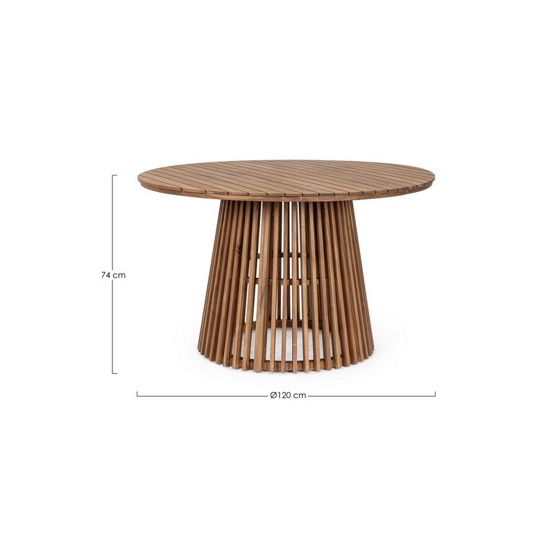 Elegante e resistente, il tavolo Rodano con diametro di 120 cm è realizzato in pregiato legno di acacia FSC 100%, garanzia di sostenibilità e rispetto per l’ambiente. La superficie è rifinita con olio protettivo, che ne esalta le venature naturali e offre una maggiore resistenza agli agenti atmosferici.