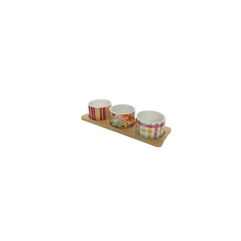 Set per tapas composto da 3 ciotoline rotonde colorate che trovano spazio su un vassoietto pratico intagliato e realizzato in bamboo.