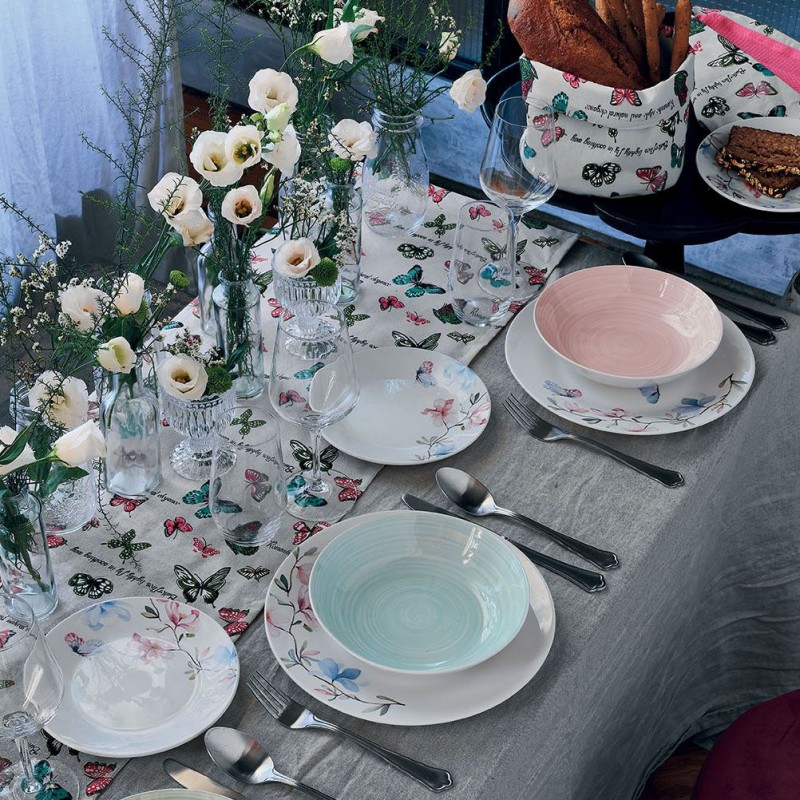 Farfalle colorate e scritte romantiche ed assortite decorano con grazia ed eleganza la collezione tessile Romance di Tognana composta al 100% da fibre di cotone riciclato prodotto con fonti rinnovabili. Questa tovaglia è indicata per tavoli da 8-10 persone ed è ideale per una mise en place fresca e romantica da completare con il servizio piatti Romance pensato in abbinato. *Per questo prodotto è consigliabile un lavaggio a temperatura massima di 40° e una stiratura a temperatura moderata. Non candeggiare. Non asciugare in asciugatrice. Non lavare a secco.