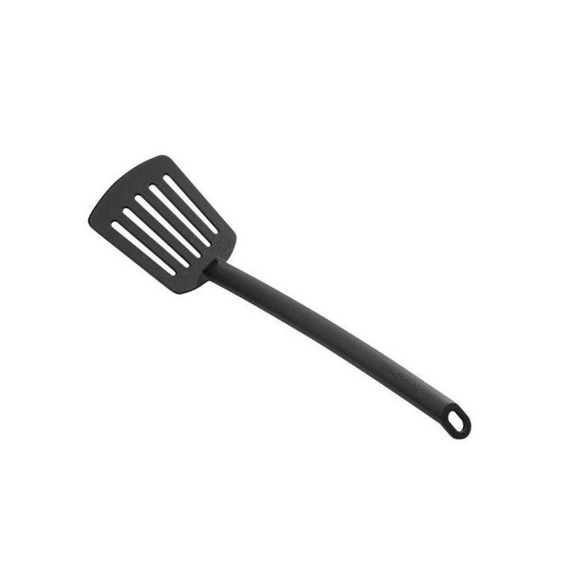 Paletta forata in nylon, particolarmente indicato per pentolame con rivestimento antiaderente poiché non ne danneggia la superficie. L'utensile è immune all'attacco degli acidi, non assorbe né odori nè colori degli alimenti.