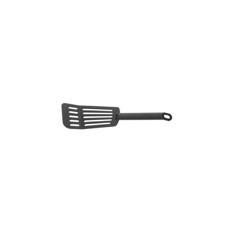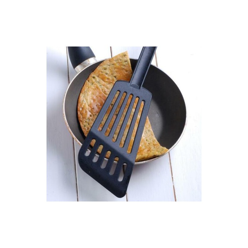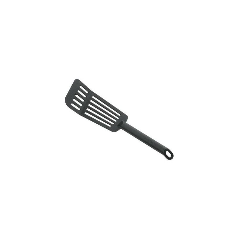 Paletta forata in nylon, particolarmente indicato per pentolame con rivestimento antiaderente poiché non ne danneggia la superficie. L'utensile è immune all'attacco degli acidi, non assorbe né odori nè colori degli alimenti.
