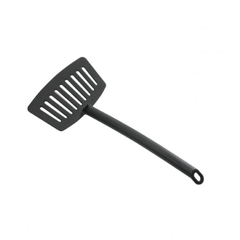 Paletta larga in nylon, particolarmente indicato per pentolame con rivestimento antiaderente poiché non ne danneggia la superficie. L'utensile è immune all'attacco degli acidi, non assorbe né odori né colori degli alimenti.