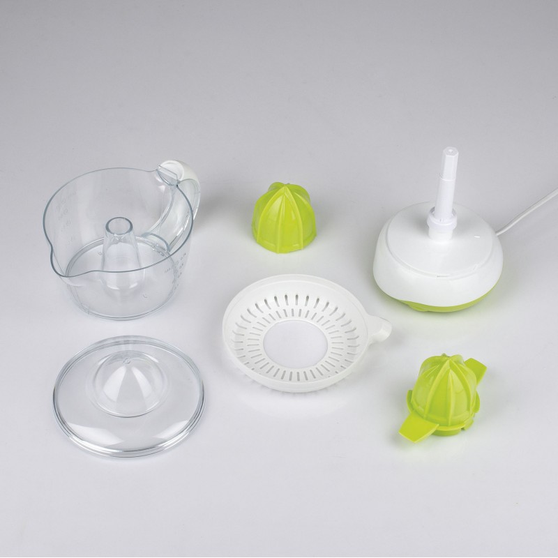 Potenza: 25 W Spremitura automatica a pressione Doppia coppa di spremitura piccola e grande Doppio senso di rotazione del cono per una spremitura più completa Capacità: 700cc Griglia filtrante Completamente smontabile per una pulizia facilitata Estetica fresca e vivace Dimensioni (mm): 200x200x140 Alimentazione: AC 220-240V ~ 50-60Hz Peso 0,570 Kg