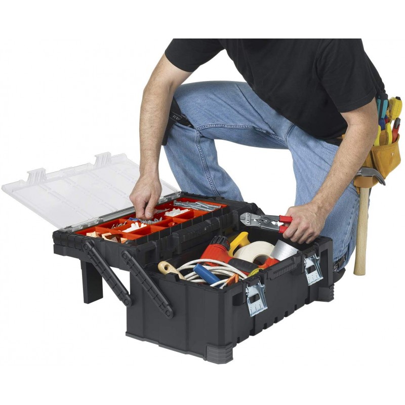 cassetta porta utensili cantilever pro tool box colore: rosso / grigio, manico in metallo robusto con impugnatura morbida, dimensioni: 535 x 305 x 240 mm, chiusura con due ganci di metallo solido, materiale: polipropilene, scomparti regolabili.
