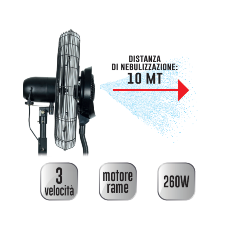Con Un Diametro Complessivo Della Pala Di 66 Cm E Una Distanza Di Nebulizzazione Di 10 Metri, Il Ventilatore E Nebulizzatore Mustang E' In Grado Di Rinfrescare E Umidificare Ampie Aree, Offrendo Un Comfort Diffuso In Tutto L'Ambiente. Che Tu Voglia Goderti La Freschezza In Salotto, In Terrazza O In Giardino, Mustang Sarà Il Tuo Alleato Ideale Per Creare Un'Oasi Di Benessere Ovunque Tu Ti Trovi