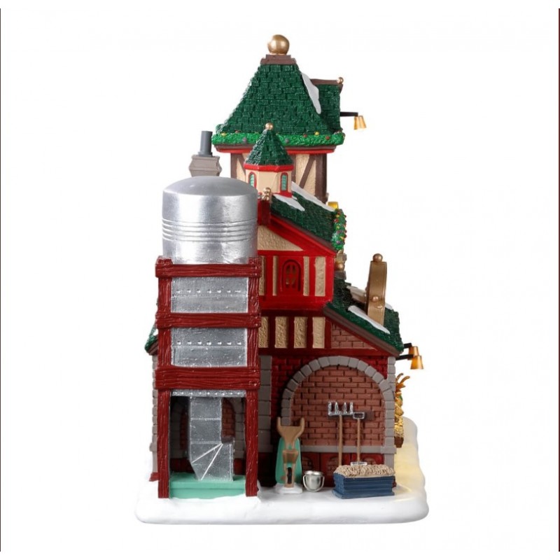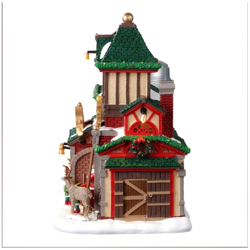 Vieni a vedere la stalla dove Dasher, Dancer, Prancer e la banda si ritrovano quando non tirano la slitta di Babbo Natale. Decorate con finiture in bastoncini di zucchero, le stalle sono calde e accoglienti per le renne mentre Babbo Natale e i suoi elfi lavorano sulla slitta e caricano i pacchi. Il grande orologio sulla parte anteriore conta alla rovescia le ore che mancano alla vigilia di Natale, quando tutti saranno pronti per il decollo.