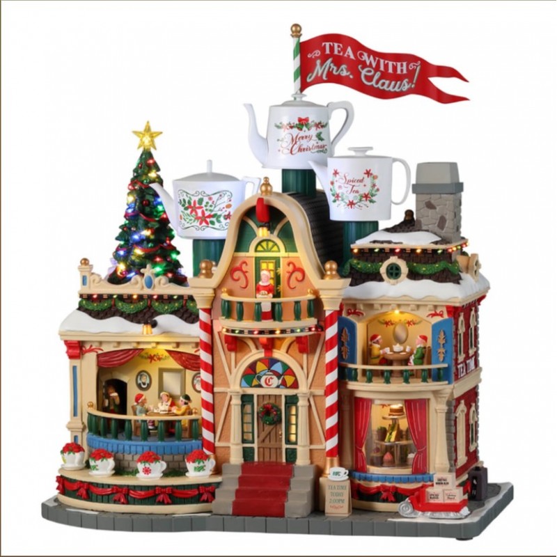 E' l'ora del tè; e quale modo migliore per bere il tè; e gustare gustose prelibatezze se non con la signora Claus? Il tè nel suo affascinante negozio includerà; sicuramente deliziosi biscotti natalizi e altre prelibatezze natalizie. Un albero di Natale illuminato in cima al negozio di tè; guida la strada mentre teiere di grandi dimensioni con disegni festivi offrono ancora più; allettamento. All'interno vedrai gli elfi che si godono un po' di tempo libero bevendo il tè; mentre la stessa signora Claus sorveglia dal balcone. Splendidamente illuminato e coperto di neve Il tèe; con la signora Claus diventerà; sicuramente uno dei preferiti delle vacanze