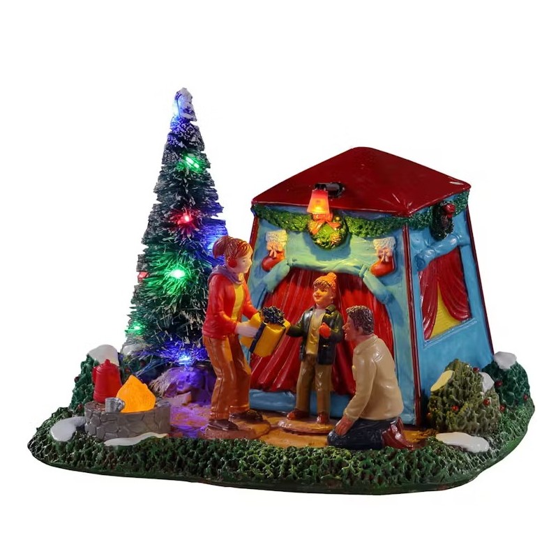 Description: In the heart of the wintry wilderness, a happy family shares a cozy Christmas camping experience. Their charming, colorful tent stands proudly beside a crackling fire that casts a warm, inviting glow. A vibrant, embellished Christmas tree lights up this joyous scene as a child eagerly receives his cherished gift from their loving mother. It’s a holiday escape into nature’s frosty embrace. Approx. size (H x W x D) 4.33 x 5.71 x 5.12 inches 11 x 14.5 x 13 cm