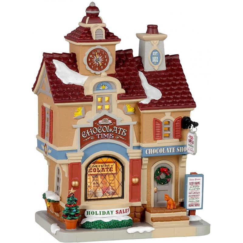 chocolate time è il negozio più dolce della città. questo affascinante negozio vende cioccolatini di prima qualità che sono perfetti regali di natale. attraverso la vetrina del negozio, puoi vedere un'esposizione illuminata di cioccolatini e diverse scatole tra cui scegliere. fuori, c'è un cartello che pubblicizza una vendita di vacanze e un elenco di sapori di oggi. vuoi un campione gratuito? entra, ma fai attenzione al gattino a guardia della porta d'ingresso.