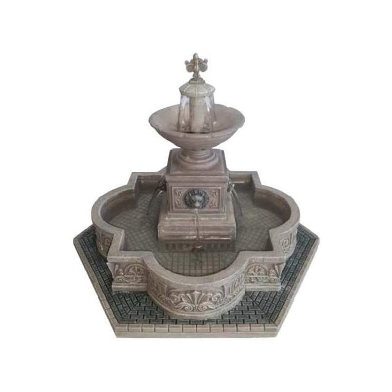la fontana riversa l'acqua nella vasca dall'alto e dai lati della struttura centrale.